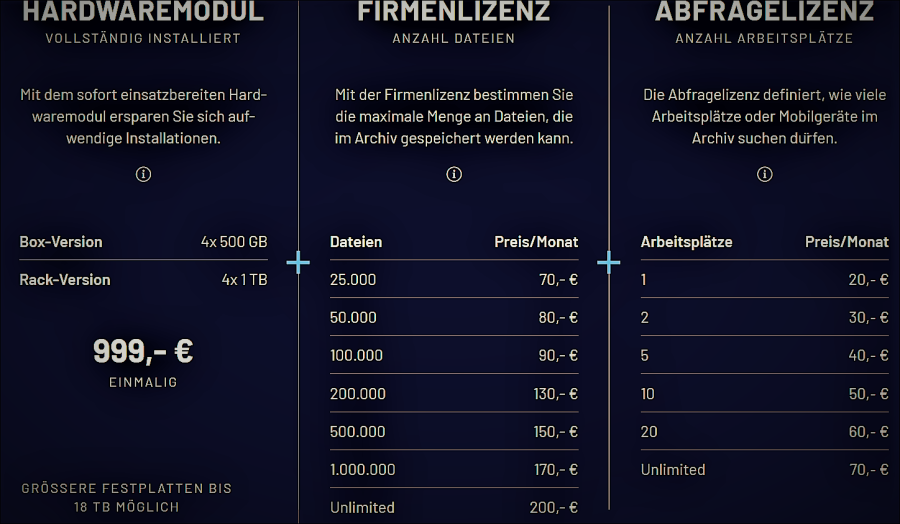 BvLArchivio ist ein Komplettsystem für Firmen, Freiberufler und Einrichtungen, die 100% Datenhoheit und Sicherheit wünschen und vor allem Dingen keinen großen IT-Aufwand betreiben möchten. Der digitale Archivserver BvLArchivio steht lokal in Ihren Räumen. Einen Zugriff auf die Daten haben nur Sie. BvLArchivio gibt es in zwei Ausführungen, als stilvolle Box-Version für Ihr Regal oder als Rack-Variante für Ihren Serverraum. Strom anschließen, Netzwerkstecker rein und sofort loslegen. Im Lieferumfang enthalten ist das Hardwaremodul (Box oder Rack) inklusive der vier Datenfestplatten, die für eine Redundanz Ihrer Daten sorgen. Ihre Daten werden also immer automatisch mehrfach auf verschiedenen Festplatten gespiegelt. Die komplette Software ist bereits vollständig auf dem Hardwaremodul installiert und kann sofort genutzt werden. Zusätzlich können Sie sich diverse kostenlose Ergänzungsprogramme herunterladen, die Ihnen das Büroleben erleichtern, wie z. B. das E-Mail-Plug-in, Explorer-Plug-in oder aber die mobile App für das Archivieren und Suchen mit dem Smartphone. BvLArchivio ist nach der Lieferung sofort einsatzbereit.